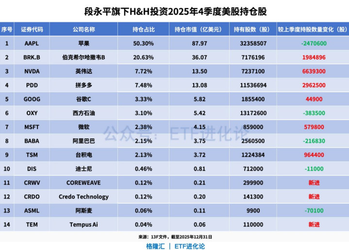 格隆汇2月18日|在大幅减握第一大重仓股苹果的同期,有名投资东说念主段永平在Q4将英伟达仓位狂拉逾11倍,并轻仓“试水”三家极具代表性的AI垂直范畴公司。数据明白,段永平Q4共增握了六只股票,其中增握幅度最大的是英伟达,增握幅度第二大的股票是伯克希尔哈撒韦;同期,段永平也减握了五只股票,减握幅度最大的是苹果。