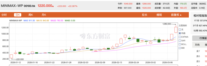3月10日收盘,MiniMax(00100.HK)股价高涨越过22%,市值站上3826亿港元,在中国上市企业市值榜中排到51位;而百度(09888.HK)当天涨幅为2.9%,市值为3322亿港元,两者市值拉开了约500亿港元的差距。