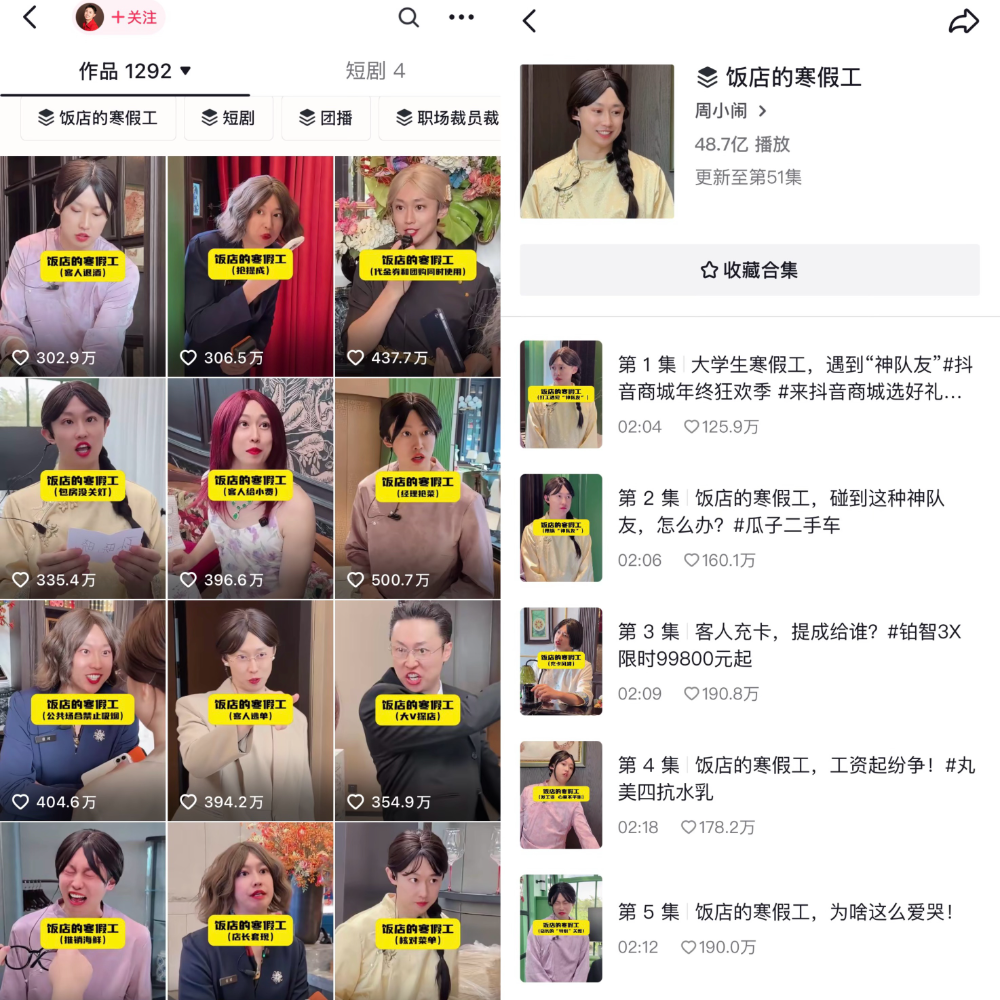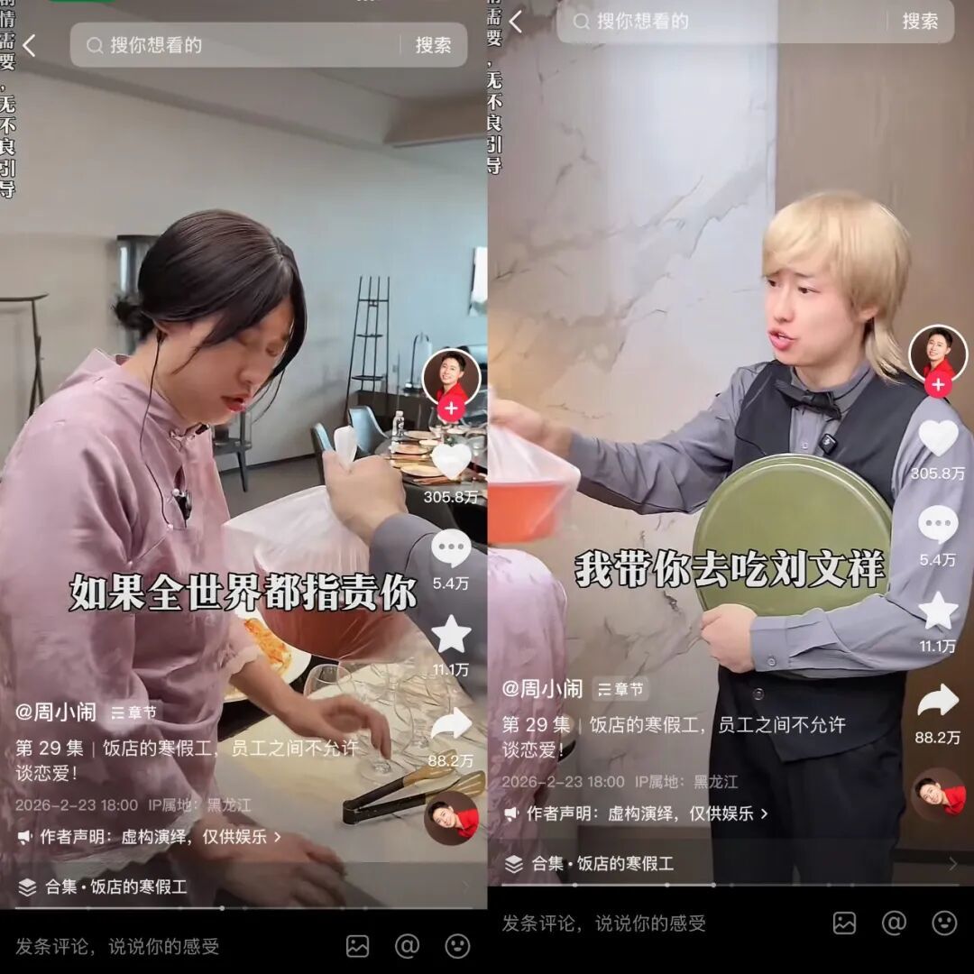 最近爆火出圈后,@周小闹 更是开启双账号日更样貌:主账号更新《饭铺寒假工》系列,矩阵号 @周小小闹(大学寝室) 同步更新《大学寝室》系列,两个账军号色、剧情互相孤独又有联动,进一步扩大流量遮蔽范围。