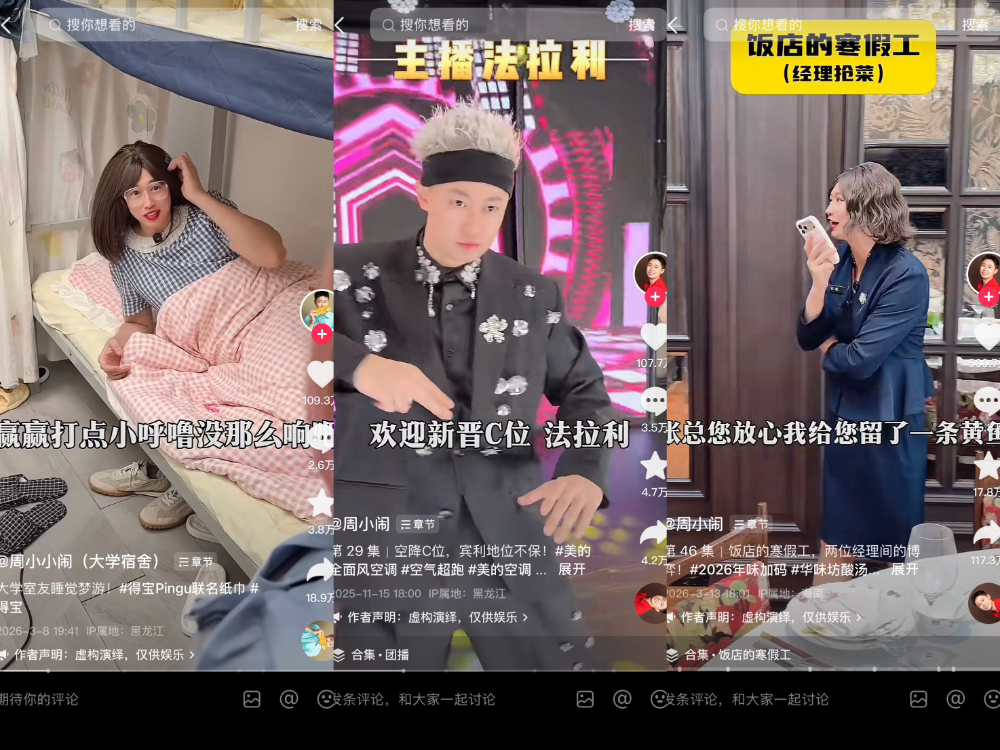 而 @周小闹 一东谈主分饰 3-4 个变装,还能保证剧情不串戏、变装不坍塌,粉丝每天蹲在抖音、小红书等更新,完播率、停留时长顺利拉满,想不火齐难。