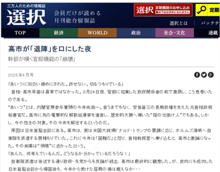 而另一家日本老牌杂志《周刊文春》则泄漏,今井尚哉动怒高市早苗,以为高市早苗“腻烦学习酬酢基础常识,总念念制造噱头来搞事情”。