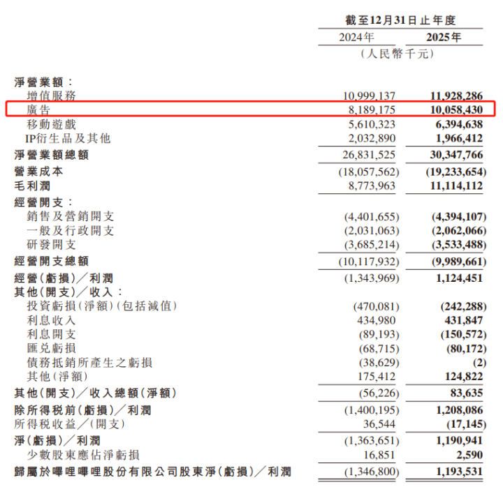 2025年,B站告白收入100.58亿元,同比增长23%。一个主要原因在于,公司尝试将AI与LLMs更深远地融入生意算法、告白创意生成以及智能投放中,使得AI关系告白投放证据尤为杰出,全年投放同比增长超150%。