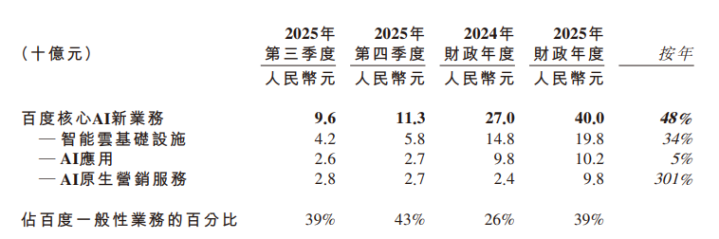 这一年,百度最底层的搜索业务加快AI转型,限度2025年10月,约70%的移动搜索终结页面包含AI生成的内容。伴跟着这轮退换,2025年第三季度,百度初度表示了AI业务的详实收入,而在Q4及全年财报中,公司更将智能云基础步调、AI愚弄、AI原生营销劳动合并为零丁版本——“百度中枢AI新业务”,2025财年,该业务收入400亿元,同比增长48%,在百度一般性业务中占比39%。