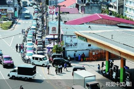 17日,斯里兰卡科伦坡,人人在加油站列队购买燃油。