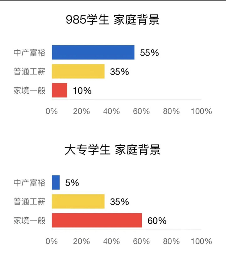你看上图,上了985大学的东说念主,其家庭经济情况一泰半(55%)中产或阔气,读了大专就毕业的,则家景大多(60%)一般、35%很普通,唯有5%是中产阔气。