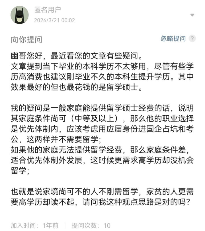 “也等于说家景尚可不的东说念主不刚需留学,家贫的东说念主更需要高学历却读不起,领导我这种不雅点想路是对的吗?”