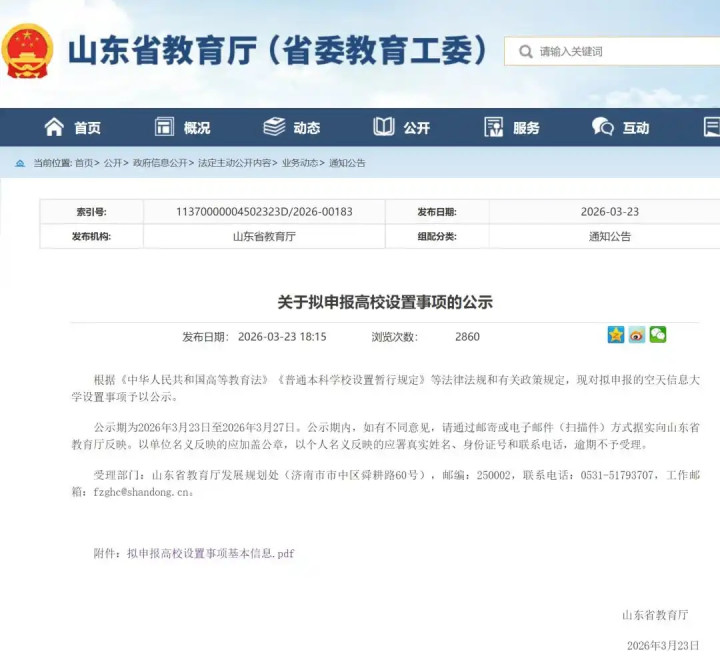 3月23日,山东省老师厅发布《对于拟陈述高校建设事项的公示》。凭证《中华东谈主民共和国高等老师法》《宽绰本科学校建设暂行章程》等法律规矩和关系政策章程,现对拟陈述的空天信息大学建设事项给予公示。公示闪现,新建的“空天信息大学”为公办本科。学校官网闪现,这是我国第一是以“空天信息”定名的高等院校。学校由山东省东谈主民政府支配,已纳入山东省高等学校建设“十四五”经营。