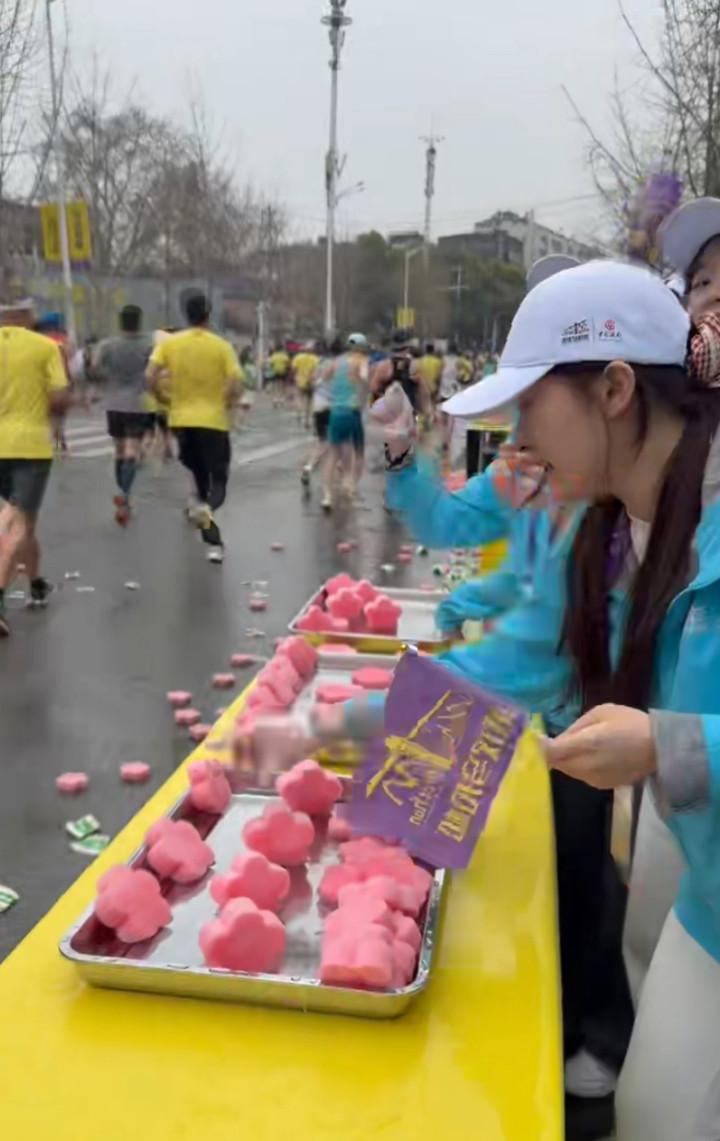 九派新闻预防到,跑谈旁还有志愿者稀奇摆放、提供粉色的樱花状吸水海绵,一位志愿者示意,这是给选手降温、擦汗,保握膂力的“擦擦”。